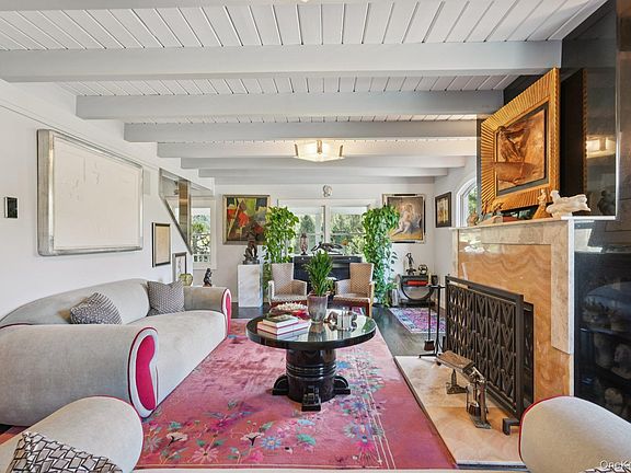 The primary suite impresses with vaulted 18 foot ceilings, skylights, and a private balcony overlooking the tranquil and lush grounds. Additional highlights include a sunroom, generously sized bedrooms, and a versatile library or office where the current owner once found inspiration to write several celebrated television shows.