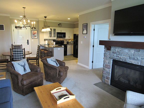 Rising Bear 312 is a well-appointed two-bedroom two-bath condo. Entering the unit the kitchen is to the left, living room with gas fireplace straight ahead and balcony. Views of Magic Mountain Ski resort in the distance. The ensuite bedroom is to the left and second bedroom is to the right. Unit has air conditioning for the few days where it’s needed in summer months. Rising Bear has reserved underground parking, ski lockers, outside pool, and hot tub. Enjoy the commons with a campfire or picnic. A short walk to the Sport Center or Village for shopping, dining, and the slopes.