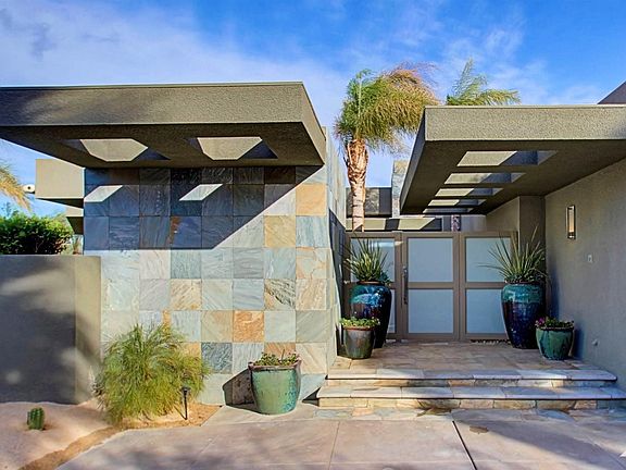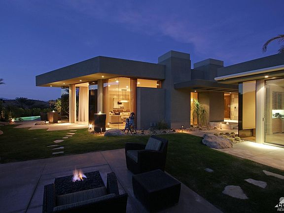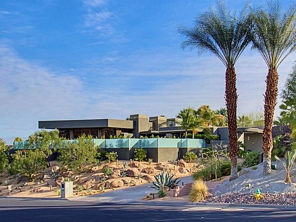 This Contemporary ultra-private Mirada Estate w/spectacular mountain & city views. Perfect for the ultimate entertainer. As you wind up the private driveway into the gated motor court, this desert Modern boasts the finest in quality and architectural detail. Private courtyard entry leads you into the double glass electronic front doors. Dramatic entry hall overlooks massive great room with a wall of glass with majestic mountain and city views. Highlights include floor to ceiling granite fireplace, sunken wet bar, all stone floors, disappearing Fleetwood doors, large gourmet kitchen with top of the line commercial grade appliances, under-counter wine cooler and Butler's pantry, large Pre-plumbed wine room. Amazing game room/theatre. Spacious master suite with sitting area, fireplace, all marble his & hers master baths, walk-in closets, 2 other guest rooms and additional detached guest Casita. 2 pools and spas, 1 in front and also additional pool & spa in back with oasis setting