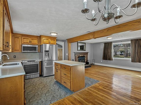 This ranch offers open concept kitchen and living space with a wood burning fireplace, plus a rec room and sun porch. Three bedroom, two bathrooms. Hardwood flooring, fenced in yard and an attached garage.