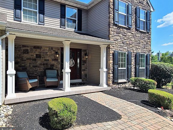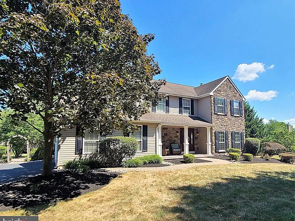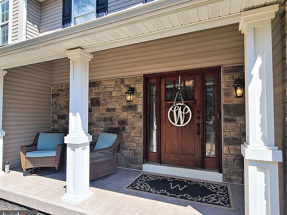 Beautiful setting for this tastefully updated colonial located in the Central Bucks School District. Great curb appeal begins with the partial stone façade, a relaxing covered front porch, manicured gardens and mature trees that line the front and rear of the property. A paver walkway leads you to the front entry. The interior is filled with plenty of natural light and finished with extensive wood trim, tasteful fixtures and a great interior floor plan for all to enjoy. The foyer includes hardwood floors, a coat closet and views of the dogleg staircase. To the right you will find French doors that open to a home office with double windows to brighten the space, refinished hardwood floors and another set of French doors that open to a formal dining room. The heart of the home is the gorgeous kitchen which offers a large center island with pendant lighting overhead, granite counter tops with a stylish tile backsplash, stainless appliances, 42" cabinetry, tile floors, extended tiered counter with bar top and space for the stools, which opens to a bright and cheery breakfast room. Here you will find high ceilings with exposed beams and skylights, a wall of windows providing allowing for views of a beautiful backyard setting and a slider that leads out to an expansive paver patio where outdoor entertaining can be enjoyed. Back inside, the breakfast room provides plenty of space for everyday dining and a relaxing sitting room with a standing gas stove and another set of French doors which open to the dining room. The dining room can also be accessed from the kitchen and provides a great space for formal occasions with the hardwood floors, double window and tasteful light fixture. The great room offers a great place to relax and enjoy some down time with vaulted ceilings with skylights that brighten the room, an attractive stone fireplace with pellet stove insert which is flanked by over-sized windows, and plenty of room for the larger furnishings. Completing the main level is a half bath with modern vanity and fixtures and a full laundry room with coat closet and access door to the two car garage. Moving up the stairs, at one end of the hall is where you will find a spacious primary bedroom with trey ceiling, two walk-in closets and a full bath, complete with tile floors and stall shower surround, appointed with seamless glass doors. The primary bath also includes separate vanities and a deep linen closet. At the other end of the hallway is where you will find three additional bedrooms, each with ample closet space and ceiling fans added for comfort. There is a full hall bath with tile floors, a soaking tub/shower, nice vanity, and a full linen closet to service these bedrooms. Completing the second floor is an additional room that currently used for storage but may be a nice place for a second office or homework room. A pulldown attic is located in the hall and may be used for additional storage. Additional living space can be enjoyed in the finished basement which is currently used as a family room, a game room/home gym. There are many to storage closets and a utility room completes this level. A whole house generator has been recently added and there are many other updates made during ownership. All this and a great location with access to a walking path that leads to the Pine Run reservoir and Covered Bridge Park. Lake Galena is a short walk away and Doylestown Borough is just a few minute drive.