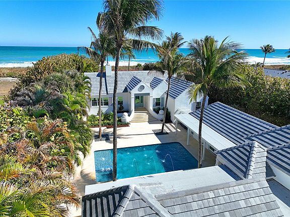 A truly distinctive completely renovated oceanfront estate on Jupiter Island, set on nearly 1 acre with a private compound layout: Main Residence + Guest House + Cabana. Designed by YRA Architecture and curated by Cece Bowman Interiors, the Bermuda style home offers exceptional privacy, impeccable craftsmanship, and true resort-style living. Highlights:100 ft of direct ocean frontage; home set 80 ft from the street; 3-car garage with 14’ clear height (fits up to 6 with lifts); premier coastal engineering. Interiors: Custom millwork, cypress ceilings; Great Room & Dining Room with 14’ ceilings; chef’s kitchen with Sub-Zero/Wolf appliances, marble counters, and designer cabinetry; butler’s pantry with second dishwasher, sink, and wine storage; cypress-wrapped office; luxury primary suite with dual couture closets and dual spa baths. Outdoor Living: Oversized pool with spa, sun shelf, deck jets, and smart controls; travertine terraces, fire pit, outdoor shower, dog wash, and Alfresco kitchen; private beach path. Guest & Cabana Houses: Independent guest suite with designer bath and morning bar; cabana with full Sub-Zero/Wolf kitchen, living area, bunk suite, and full bath. Construction & Tech: Cat-5 Eagle roof tiles; Kolbe impact doors/windows; whole-home generator; Lutron lighting; whole-home audio; Cat-6 wiring; security cameras and video entry. A turnkey, design-driven oceanfront estate in one of America’s most exclusive enclaves. Shown by private appointment only.