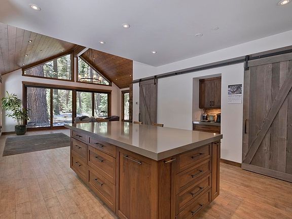 Rare opportunity to own a gorgeous custom home sitting on a half-acre estate sized parcel in a tranquil and private setting just steps from Mammoth Creek. This Presson Construction home offers craftsmanship unmatched by any other properties on the market in Mammoth Lakes. Gorgeous DeWils custom cabinetry and quartz countertops in the kitchen and baths, beautiful lighting throughout the home including Tolomeo Reading Lamps from Artemide in bedrooms, a Metro Collection Logan free standing tub by Hydro Systems in the primary suite’s bathroom, tiled showers, glass shower enclosures, white oak plank flooring upstairs and “wood” plank tile floors imported from Italy on downstairs offering ease of maintenance. Large picturesque south facing windows open to the forested backyard with plenty of space to entertain outdoors in the summer and an additional outbuilding that could be used for storage, a playhouse or meditation room nestled near the rear of the lot. Full ceiling height custom rock hearth and real wood fireplace create an inviting space to gather with family and friends. Open plan living space with living and dining areas open to the large kitchen island and gorgeous kitchen. Beautiful kitchen with stacked stone full height backsplash, Thermador appliances, 6-burner range, double ovens, large basin sink, an additional separate appliance area, and plenty of storage in the adjacent pantry. Thoughtfully laid out floorplan with three bedrooms and two bathrooms on the upper-level bathrooms, and living, dining, kitchen, and a den/ accessory office on the lower-level. At over 2100 square feet this recently completed home has it all including hydronic heating and interior fire sprinklers, reclaimed wood sliding barn doors, built in custom bookcases and drawers, hardwiring for TV’s, remote window blinds, metal roof, huge driveway and a 2-car garage. Located in a quiet neighborhood bordering open space with the creek & Town Bike path within steps of your front door.