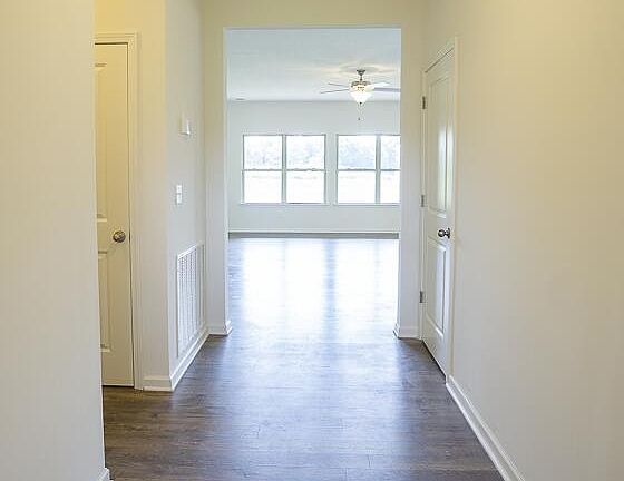 The appealing one-story home includes many contemporary features, and an open-concept design and 9' ceilings enhance the wonderful feel of this home. The kitchen includes a large island perfect for bar-style eating or entertaining, a walk-in pantry, and plenty of cabinets and counter space. The dining room and living room both overlook the covered porch, which is a great area for relaxing and dining al fresco. The large Bedroom One, located at the back of the home for privacy, can comfortably fit a king size bed, and includes an en suite bathroom with double vanity, big walk-in closet, and separate linen closet. Three other bedrooms share a second bathroom. The two-car garage connects to the front hallway where the laundry room and an extra storage closet are also located. Pictures, photographs, colors, features, and sizes are for illustration purposes only and will vary from the homes as built