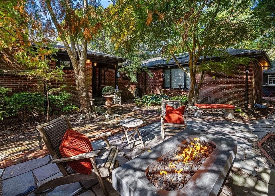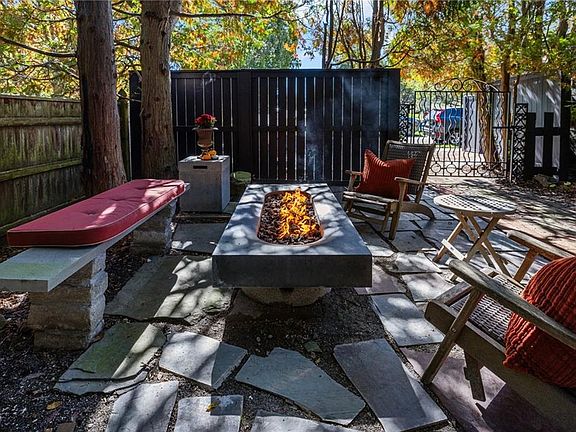 Welcome to Cedarbrick. This chic and sophisticated single-level bungalow is the perfect retreat, boasting designer finishes, stylish colors, and elegant décor. Recently updated and new to the market, the home features Bosch appliances, refreshed bathrooms, and the comfort of central air. The property includes three secluded, fenced-in patios, offering privacy and an ideal location near beaches and yacht clubs. Inside, the open-concept living area is filled with natural light and centered around a stunning stacked slate fireplace. The primary bedroom is a serene space with a cozy sitting area, gas fireplace, walk-in closets and abundant natural light. The luxurious emerald-hued en-suite bathroom includes a clawfoot soaking tub and a step-free shower. The second bedroom is equipped with a queen bed and a desk, providing a versatile space for rest or work. A charming den, perfect for movie nights, opens to the private brick back patio, an ideal spot for al fresco dining, complete with a tranquil Koi pond. A freestanding studio/shed is nestled in the corner. The side patio offers a cozy fire pit, while the south-facing front patio, accessible from the kitchen, provides a peaceful, secluded outdoor area.