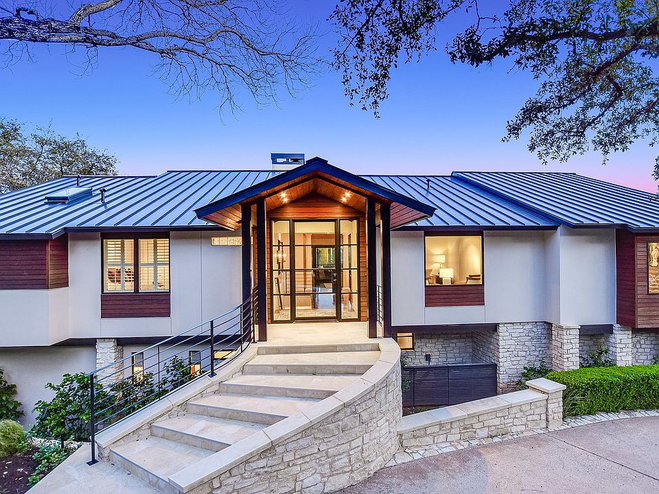 Sited on a large lot in the exclusive, family-friendly enclave of Rob Roy, this charming, recently-renovated home is designed to be one with its hillside location. Great contemporary street appeal is accented with a custom Durango front door, exotic hardwood accents, custom steel railing and large-format limestone steps; even the lighted glass garage doors are an architectural feature. The expansive one-acre lot allows for resort-like amenities: a large negative-edge pool, three levels of decks plus a separate dining deck with a cozy firepit, a large lighted sport court and a lush swath of greenbelt for exploring. The exceptionally convenient location is minutes from two country clubs, shopping, and schools. The home itself is well-designed for a family; on the main level, two living areas, formal and informal dining and kitchen plus the master suite and second bedroom suite. Both living areas open to a wall of sliding doors that access the large IPE deck and outdoor amenities. The master retreat is luxuriously appointed with a fireplace and seating area, coffee bar/refrigerator and exceptional views out over the hills. The lower level features a large media/game room that opens to covered decks accompanied by two bedrooms and bathrooms with adjacent office/fourth living space. With the location in the desirable Eanes School District, this property is just waiting for its new family to move in and start making memories.