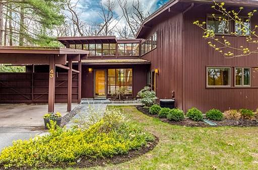 A Jewel of architecture! Designed + expanded later by Walter Pierce, this stunning Mid-Century modern home in award-winner Peacock Farm neighborhood is beautifully sited, South facing, overlooking the Conservation land. Striking entertainment-sized living with glass walls, transom windows, and a 4-season solarium allow year-round light and nature views. Kitchen boasts maple cabinets, high-end appliances, Corian tops and center island. 1st floor wing has master suite with dressing room and dble vanity bath, home office and recreational room with built-in library. Children's wing has 2 generous bedrooms, 1 bath and a play room with built-ins. Separate 4th bed with en-suite bath, perfect for au pair/ guests. The grounds are magnificent with mature plantings, stone walls to leveled yard & bluestone patios, with unobstructed views of the surrounding land. Communal heated pool nearby. Easy access to Rte 2, Cambridge & Boston.
