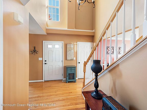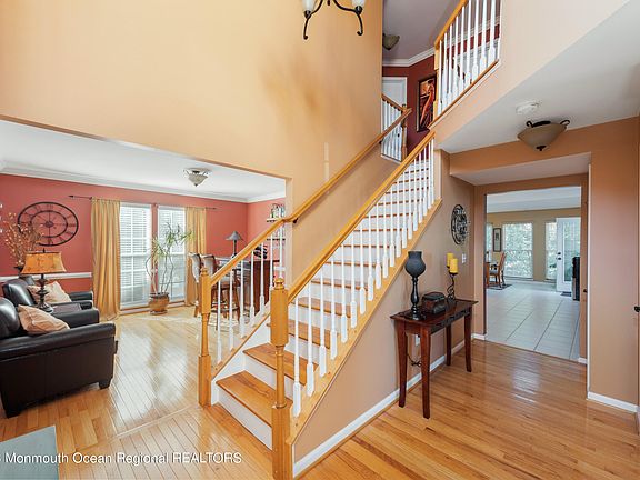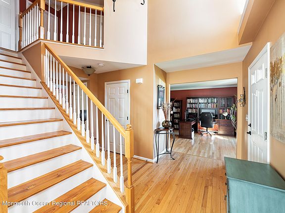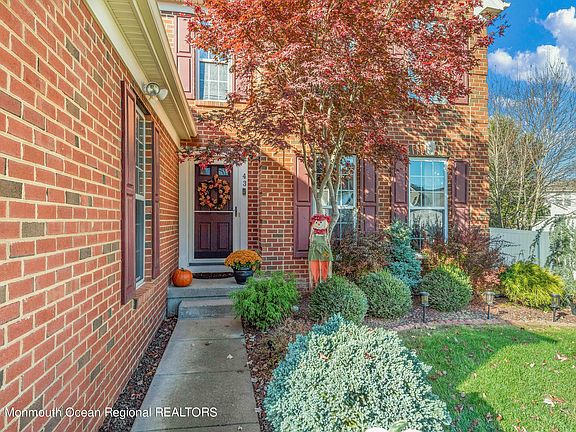 Welcome to this lovely brick front expanded Colonial in the sought after Toscana Community in North Howell! This 4 bedroom, 2.5 bath home has plenty of upgrades & features hardwood floors throughout. 2 story entryway leads to an office & formal living space on either side. The open & bright floorplan includes kitchen w/ stainless steel appliances & pantry, family room w/ gas fireplace, & sunroom w/ vaulted ceiling & skylights creating the perfect space for entertaining! Newer French doors lead to the lighted Trex deck & backyard with large paver patio, privacy trees, & fence. Upstairs, find 4 spacious bedrooms. Main BR has 2 large closets (one WIC) & bath with Jacuzzi tub. Don't miss your chance to own this beautiful home! Guest bathroom was renovated within last 5 years. Newer