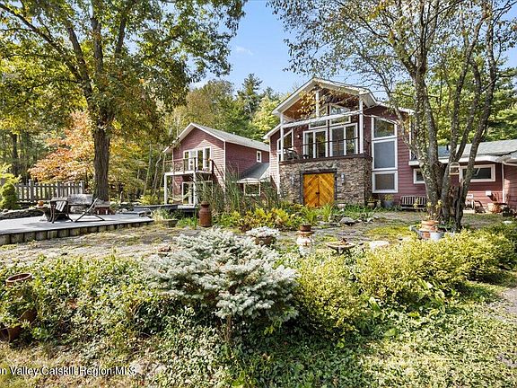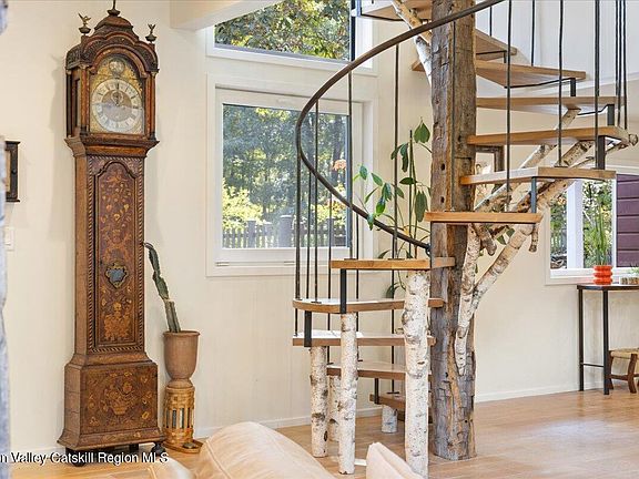 Set back on a private 36 acres, this enchanting property will impress you the moment you drive up into the woods, and lay eyes on the rustic yet charming home. Upon arrival, you will notice the gardens, stone patios, and large goldfish pond. The whimsical front door welcomes you into the perfect spot to hang your coat, remove those hiking boots, and come on in. The 2014 renovation is apparent throughout but especially in the open concept living room, dining area and spacious kitchen with soaring windows and thoughtfully chosen custom details including 100 year old beams, black walnut spiral stairs, a newer wood stove, custom cement countertops and white washed tung + groove ceilings. The main level also features a large family/game room, office, 3 season room, bedroom, laundry and 2 bathrooms. Both 2nd level bedrooms have their own set of stairs, balcony, and large ensuite, offering a unique layout and privacy. The primary bedroom and ensuite have just been renovated and includes a spa-like sauna and radiant floors. Custom touches continue throughout the home. Outside is a nature lover's dream with both a fenced-in veggie and flower garden, perfectly placed hammocks, firepit, and open grassy areas. Also, on the property is a brand new 900 sq ft garage with 12 ft ceilings, mini split, and wifi. This property truly has a little something for everyone and is located near all the sought-after hiking/biking trails, farm to table restaurants, and craft breweries. Just down the road is kayak access and hiking trails along Louisa Pond.