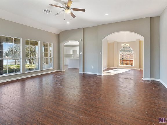 This appealing 3 bedroom 2 bath lake front home in Riverwood Subdivision is listed below appraised value. At first sight from the foyer the window lined living room displays the pleasant waterfront view. Natural light enhances the ceramic wood tile flooring and color scheme throughout the living room, kitchen, and formal dining room. The kitchen includes a breakfast nook, a spacious island, and granite countertops throughout. From the kitchen you can access the covered patio area in the backyard to over look the lake providing a tranquil atmosphere to enjoy. The split floor plan offers the master en-suite with serene waterfront views. The additional bedrooms, hall bath, and laundry room are nestled away for quiet enjoyment.