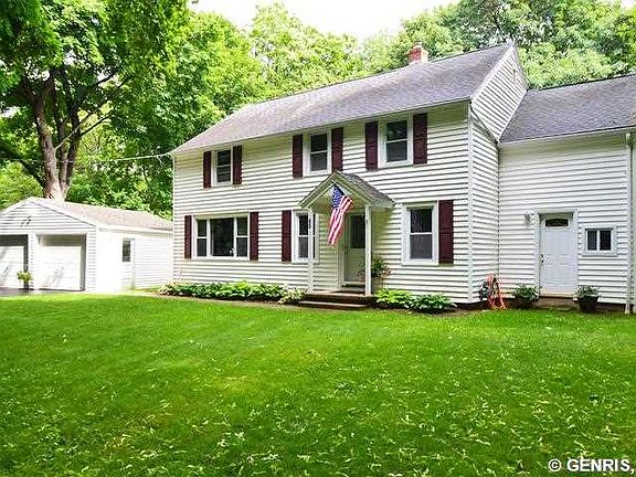 Private, Peaceful, Perfect! This spacious Colonial overlooking Erie Canal & comes with an additional lot. Warm & inviting living room offers gas fireplace, gorgeous beamed ceiling & hardwood floors that lead to formal dining room. Updated eat-in kitchen w/beautiful maple cabinets, tile backsplash & dinette. Hrdwd floors continue through the house & into the 3 large bedrooms upstairs. Updates include: windows, roof, kitchen & boiler. Gentle breeze through the tree tops will be your lullaby on the patio overlooking the beautifully maintained yard & Erie canal.
