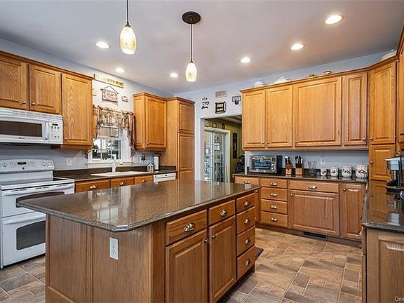 5 Bedroom, 3 bath spacious home nestled on 5+ acres of partially wooded, level land. This warm home features formal dining and living rooms, an eat in kitchen, floor to ceiling stone fireplace (propane), a wet bar, a main floor master with master bath that has a jetted tub, walk in shower and 2 spacious walk-in closets, 3 bedrooms upstairs, entertainers sunroom, fenced dog run accessible from the patio, enormous partially finished basement with 2 finished BONUS rooms storage closets. The basement is plumbed to accommodate a second kitchen and bathroom. On demand whole house water heater, central heat and air on the main level with zoned heating and air conditioning on the top floor. Park your toys in the 3 car garage or create a work space for yourself. Features oak floors on the main level, expansive eat in kitchen with large center island and more storage than you will need. Visit close-by outdoor adventures, Villa Roma Resort or Bethel Woods nearby.