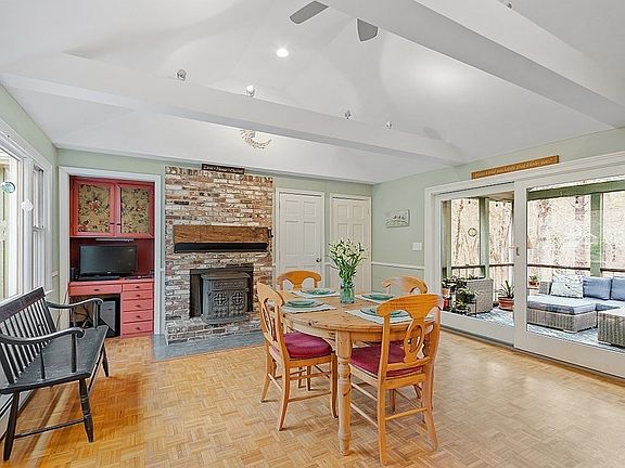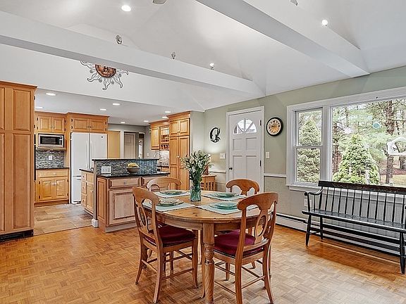 Peace and tranquility greet you as you approach this spacious Royal Barry Wills hip roof Colonial nestled in a private cul-de-sac in a prestigious East Boxford neighborhood. The heart of the home features a large EIK with cathedral ceiling, fireplace, center island, coffee/wine bar and a slider to the 3 season porch with skylights. The sun drenched living room is spacious and comfy with a wood burning fireplace, hardwood floors, built in bookshelves and a window seat perfect for reading. The first floor also boasts a formal dining room with crown molding and hardwood floors for those special occasions; an inviting office with built in shelves & hardwood, and a 1/2 bath. The second floor boasts a master suite, 3 generous sized bedrooms and another full bath. This inviting home is situated on 2 wooded acres and is surrounded by State Forest with multiple entry points perfect for hiking, biking & dog walking. Let nature envelope you in this retreat from the hectic pace of life!