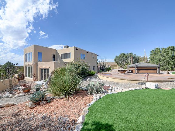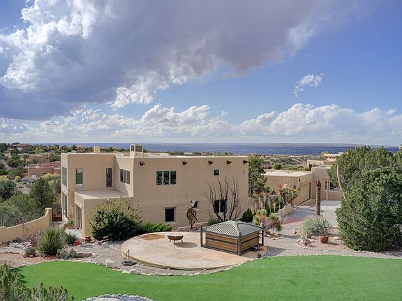 Discover your private, quiet retreat in this custom adobe home with breathtaking views and an abundance of natural light. Freshly painted interior! The spacious layout includes a huge primary bedroom & bath, perfect for relaxation and tranquility. Options abound with many large rooms for either workspace, artistry, gym/yoga or additional bedrooms! Separate large heated workshop for all projects plus tons of storage throughout. Beautiful courtyard area & large back deck for outdoor entertaining while enjoying breathtaking views of the Sandia! Just minutes from I-25 and groceries/restaurants right down the street!