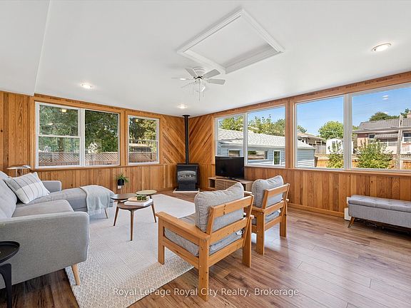 *New Price* This charming 3-Bedroom, detached 1.5-storey home is located in the desirable St. George Park area of Guelph. The home has been meticulously cared for, w/ tasteful updates & design choices throughout. The spacious kitchen features new stainless steel appliances & matching sink & faucet. A window above the sink allows natural light to fill the space and the cutout between the kitchen & dining/living area keeps you connected with family & guests while preparing meals. This room also has a large front window that frames a picturesque view of the lawn & mature trees. There is a main-floor BDRM (the perfect home office) & just down the hall is an updated 4-piece BATH. The great room addition at the back of the home provides a cozy, sun-filled retreat w/ wraparound windows, pot lights & a corner gas fireplace. Sliding glass doors lead to a covered deck, which opens to a spacious, fully fenced backyard & patio area. There is even a detached workshop (10 ft x 28 ft) equipped w/ cabinets, shelving, lighting, & electrical, offering space for yard equipment, tools, & storage. It could also make an excellent studio. On the second floor, the primary BDRM has ample space for your bed & additional furniture, as well as a closet and large window. There is another well-sized BDRM on this floor with a closet, large window and room for a bed and some furniture. At the top of the stairs, an adorable built-in linen closet provides extra storage. The finished rec room in the basement is perfect for relaxation & entertaining, w/ pot lights, carpeting, built-in shelving, & a built-in bar w/ storage. The laundry area includes a sink, shelving, & extra storage, plus a cold room at the back. The long tandem driveway accommodates 3 cars. Close to great schools, parks, recreation centre, public transit & lots of amenities. Recent Updates: laminate flooring, AC(2025), fridge/stove(2025), dishwasher(2022), water softener(2021), roof ridge cap repair(2024) Such a fantastic opportunity!