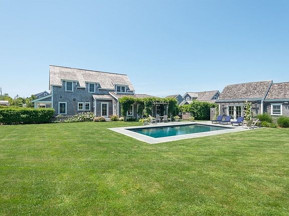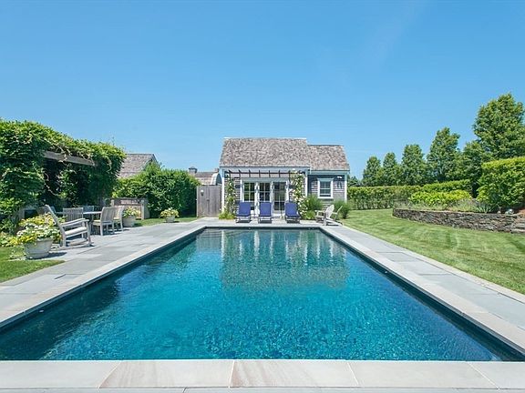 Retreat to this private oasis with new interiors by Serena & Lily. Elegant and private with pool and expansive yard, High Tide is a short walk to Town. Beautifully landscaped property with 4 bedrooms/4.5 bathrooms, plus separate pool cabana with lofted sleeping space for two and full bath. First Flr: Sophisticated open floor plan great for entertaining. Kitchen has Wolf/Subzero appliances, marble countertops and opens to two large living rooms with flat screen TV, gas fireplace, wet bar, dining room, study, half bath. Wireless Sonos sound system. French doors open to bluestone patio, outdoor grilling station, dining area, pool, lawn and outdoor shower. Second Flr: Primary (king) bedroom with private balcony overlooking pool and yard, en suite bath with double vanity and large walk-in shower. Second ensuite bedroom (two twin beds) has two pedestal sinks and shower/tub. Laundry room. Ground Flr: Third ensuite bedroom (king) Fourth (queen) bedroom en suite. Living room w addl patio area.