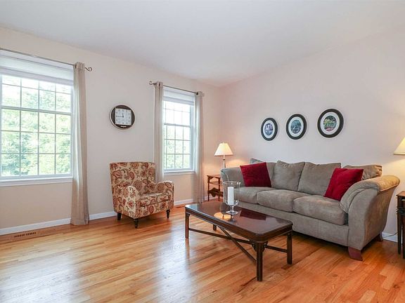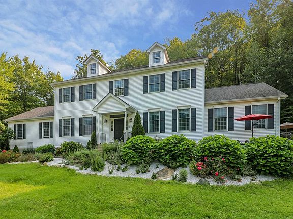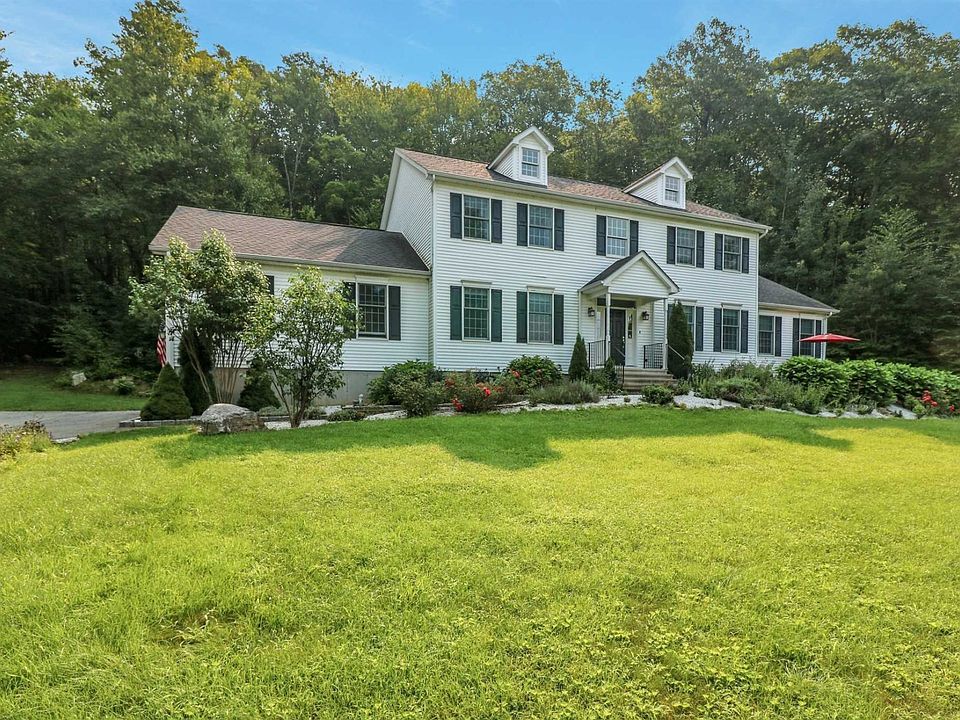 Commuters delight! Elegant, spacious center hall Colonial situated on 1.95 acres in cul-de-sac neighborhood. Surrounded by lovely perennieal gardens and rock out-croppings, this roomy 4 bedroom, 3 bath home offers appealing design and functionality. Enter into two-story foyer flanked by formal dining room and living room with hardwood flooring; custom kitchen loaded with maple cabinets, center island, stainless appliances with double wall oven with convection and granite counters; enormous family room with cathedral ceiling; and main floor den with full bath. Master en suite offers spacious bedroom with his/hers closets and master bath with jetted tub. There are 3 additional good-sized bedrooms and hall bath. Full, unfinished basement with bilco door and large 2 car garage. Enjoy several private patio areas among the beautiful grounds.