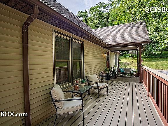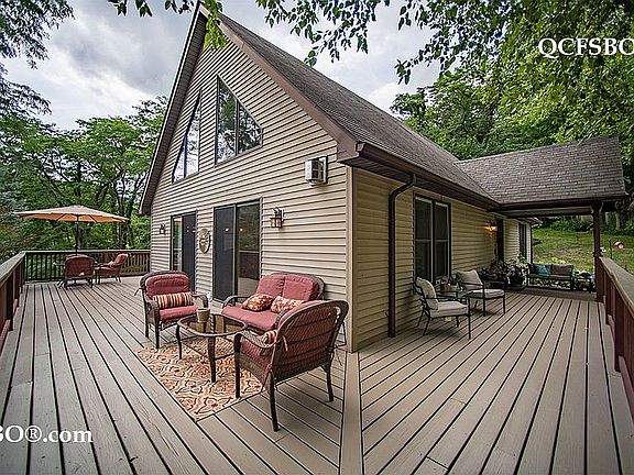 This beautiful home is in the much sought-after Hickory Hills Subdivision of Blue Grass IA. Situated on a large 1.55-acre corner lot, this property takes you into the heart of nature while keeping you close to Davenport, Moline, Rock Island and Muscatine. The house is 2046 SF with 3 bedrooms and 3 baths. You'll find beautiful oak hardwood floors throughout most of the first floor. The kitchen has beautiful cabinetry with solid surface countertops and tiled backsplash. All appliances are of high quality; Gas stove, microwave, refrigerator, dishwasher, washer and dryer. The countertop offers space for a quick breakfast or snack. The dining room opens onto the kitchen and living room, giving the house a pleasant flow. The master bedroom is on the second floor and is beautiful and spacious There is a good size bonus area loft on the second floor overlooking the living room and stone gas fireplace. Two sets of sliding glass doors bring the incredible view into your living room, but step outside and you'll find an entertainment paradise for you, your family and your friends. The 865 SF wraparound deck lets you plan almost any get together. The house has an oversized 2 car garage which allows for plenty of storage. The finished basement can be used as an extra bedroom or entertainment area and has 3 closet and a bathroom with shower. Outside the house there is a large outbuilding of 690 SF. This building has a second 2 car garage with front and rear doors and a very large workshop with heat and water. This building also has an attic for an incredible amount of additional storage. Next to the outbuilding is a Goliath basketball court and a fire pit. All of this protected by a security system. This property “must be seen"; someone will be a very happy new home owner!