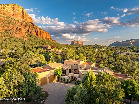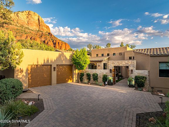 This meticulously crafted single-level Mystic Hills residence seamlessly blends the splendor of nature, contemporary architecture & fantastic Red Rock views of Elephant Rock, Cathedral Rock & more. Built in 2014-this home highlights: exquisite finishes, unmatched amenities, framed RR views, privacy & features a 2495 Sq Ft main residence + a 352 Sq Ft Casita/Studio, 4 BR, 3.5 BA & includes the adjacent parcel, approx. .95 acres in total. The privacy is enhanced via the three gorgeous courtyards, creating the feeling of a luxuriant enclave. Every corner of this home has been thoughtfully designed, from the expansive floor to ceiling windows, natural stone walls & designer fixtures. Impressive quality! This one-of-a-kind home is straight from the pages of a magazine. See supplement! The HOA Dues are billed as: $633.00 Semi Annually.