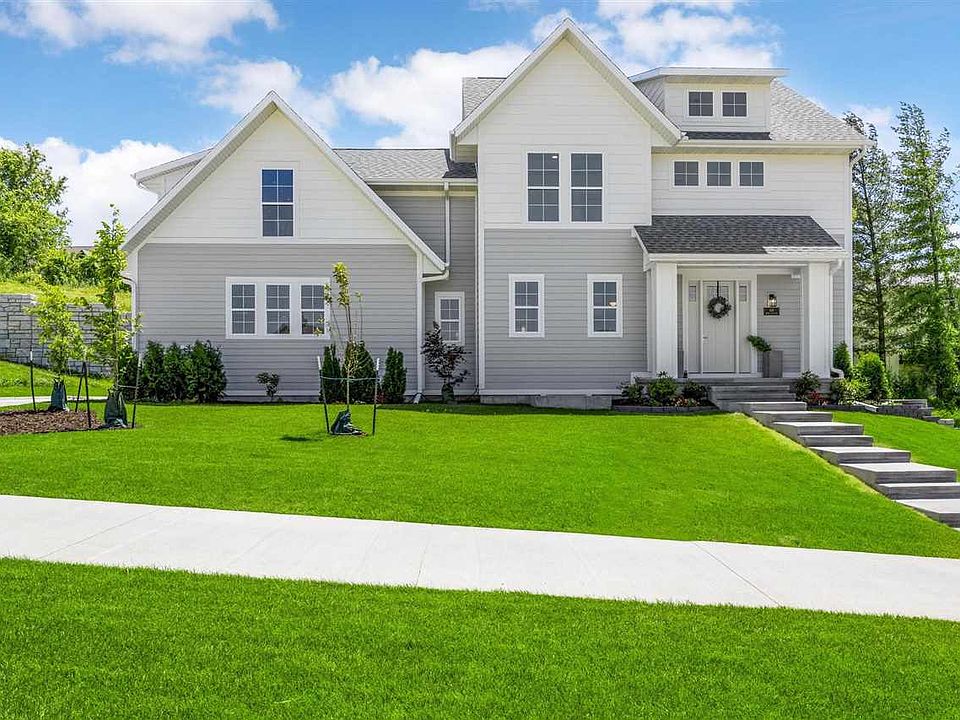 The 2024 Minimalist Craftsman home designed by Brooke Mennen-Talsma in Coralville's new luxury neighborhood, Auburn Ridge. The traditional craftsman vibe is met with asymmetrical architectural and other modern elements. Features an open staircase foyer entry, open floor plan, gas fireplace, hardwood flooring, designer light fixtures, slow-close cabinetry, quartz counters, stainless appliances, pantry with garage pass-through, large eat-in island, mudroom, tiled baths, tiled primary shower, soaking tub, double vanity, primary walk-in closet, loft, 4-bdrms on same floor, wet bar, front porch, deck, and private yard.