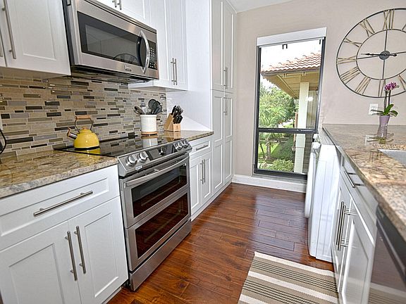ThIs home has been beautifully updated and stylishly furnished to include modern fixtures and finishes. It features IMPACT DOORS AND WINDOWS THROUGHOUT, providing added safety and energy efficiency. The kitchen has been updated with new stainless steel appliances, including a Samsung Duo stove, as well as a stylish glass/tile backsplash and updated lighting. There is also a full-size washer and dryer for added convenience. The bathrooms have been remodeled with modern vanities, tile, & frameless glass shower doors. The living space is open and inviting, with porcelain tile floors, roller shades throughout and plenty of natural light. Overall, it is a stunning and contemporary place to call home.The unit is being sold TURNKEY. NEW A/C & Nest 2021