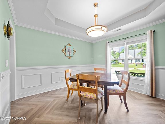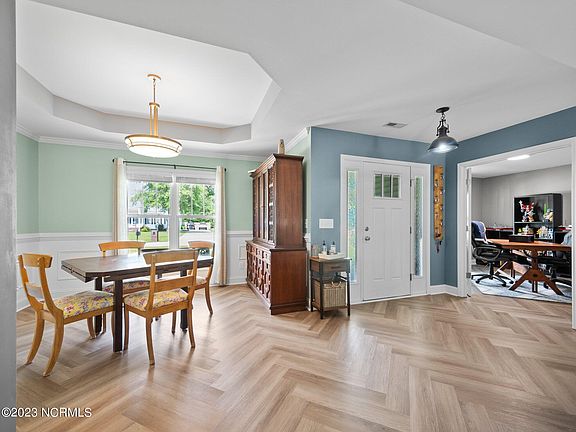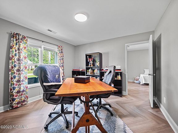 In addition to the bedrooms and living areas, this home also includes an office and a bonus room, offering flexibility for work or leisure activities. The outdoor space is equally impressive, with a fenced yard for privacy and safety, and access to Onslow County's Oakhurst Nature Park and Oakhurst Landing and Nature Trail. The park features a dock and kayak/canoe launch, making it easy to enjoy the beautiful natural surroundings.
