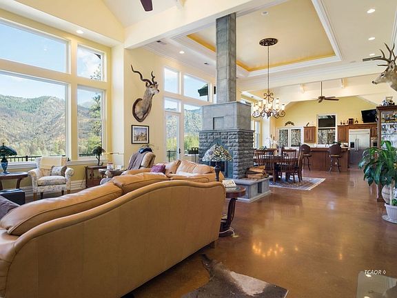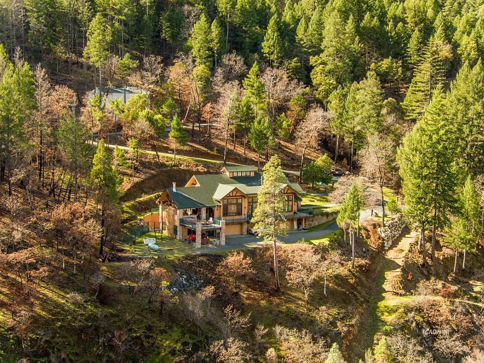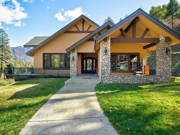 This iconic river home feels like a lodge perched on the bluff overlooking the perpetually scenic Trinity River.. Built to last - all steel, concrete, Structural Insulated Panels, and stucco yet looks like a log-themed lodge is set in the scenic environment of one of the best salmon and steelhead fishing holes on the river. Finished in 2011, with almost 4400 total square feet all with easy-to-maintain polished concrete floors with radiant heat throughout - (4 zones including outdoor patio), and two zones for forced heat and air. With 3 garage bays, the space can occupy up to 6 cars, boats and toys. The convenience of the dumb waiter from the garage to pantry makes moving groceries and firewood a breeze. If you need more shop space, the 30' x 50' commercial shop with full bathroom and dual roll-up doorsprovides plenty of workspace and covered storage. The 600 amp electric service will power whatever hobbies or projects you could possibly desire! TheTulikivi soapstone fireplace, imported from Finland, is the focal point of the great room, passively dividing the living room and dining / kitchen areas. The kitchen boasts top of the line appliances and massive granite counters.