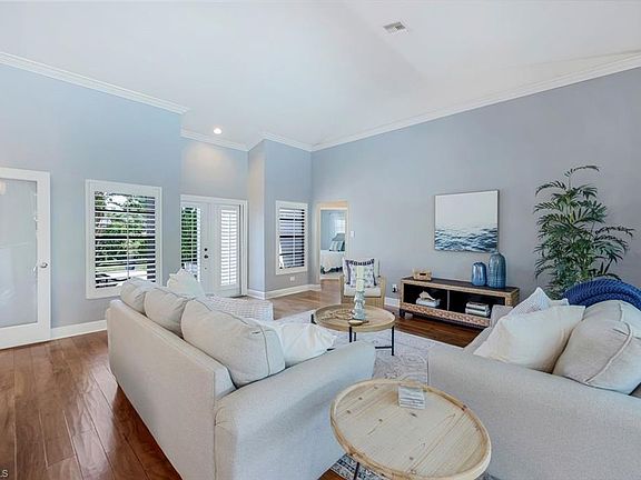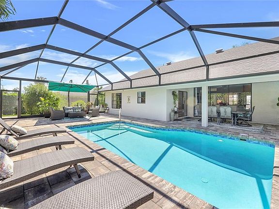Welcome to this bright and open 3 bedroom plus den home with a blend of elegance and comfort. Upon entering, you are immediately greeted by the spaciousness provided by the vaulted ceilings that allow natural light to filter into every corner. The open-concept layout seamlessly connects the living, dining, and kitchen areas, creating an inviting space for both relaxation and entertainment. The heart of the home, the kitchen, boasts stainless steel appliances, sleek quartz/granite countertops, and an island that allows you to interact while in the kitchen. A set of sliding glass doors opens up to a private outdoor oasis, where a pristine resurfaced pool with newer picture window pool cage becomes the centerpiece of leisure and relaxation. The primary suite offers a spacious retreat complete with a walk-in closet and an ensuite bathroom. Two additional bedrooms plus a den provide comfort and versatility, easily adaptable to serve as guest rooms, home offices, or hobby spaces. A newer Roof and AC gives any new owner a piece of mind. Meticulous landscaping surrounds the property, offering a sense of tranquility and privacy. It is truly an oasis!