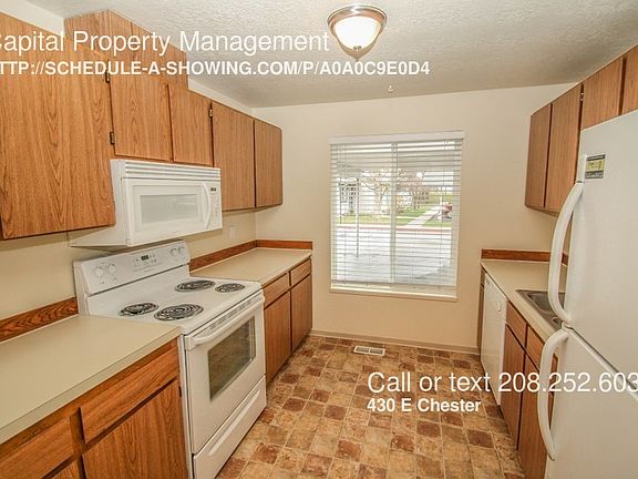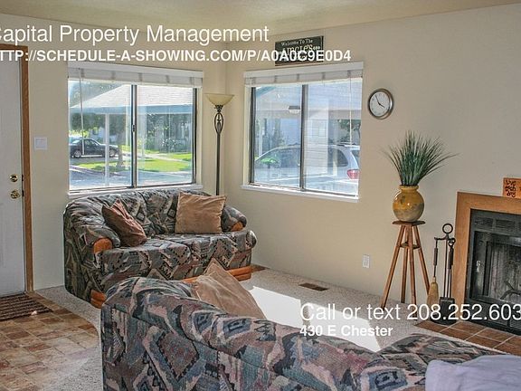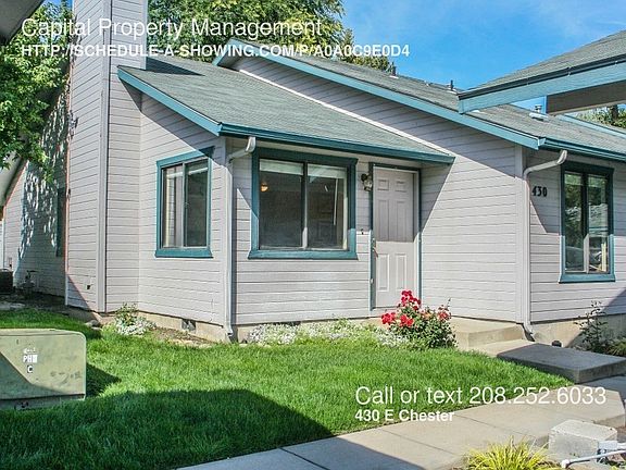 SCHEDULE A SHOWING ONLINE AT: showmojo.com/lh/a0a0c9e0d4 Sophisticated townhome in desirable SE Boise location; Backs up to Logger's Creek; 2 bedroom/2bathroom END UNIT with fireplace and private patio. New carpet. All kitchen appliances. Washer, Dryer included. Single car carport and one extra parking space; Close to downtown Boise, Boise River, BSU, and the Greenbelt. Williams Park, which has BBQ pits, basketball courts, and tennis courts, is located just a few blocks away. Deposit $850 OAC. 12 month lease term. Owner pays sewer & trash. Lawn care handled by HOA. Sorry, no pets, no smoking. Schools(Subject to verification by applicant): Garfield Elementary, Les Bois Jr High, Timberline High. From Boise Ave go east on Pennsylvania, north on Myers, east on Chester to 430 Chester in the Boardwalk Townhome Subdivision. OR, from Parkcenter Blvd, turn west on Pennsylvania, north on Myers, east on Chester.