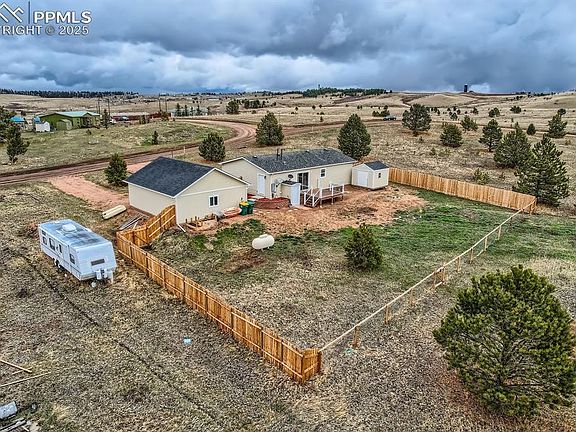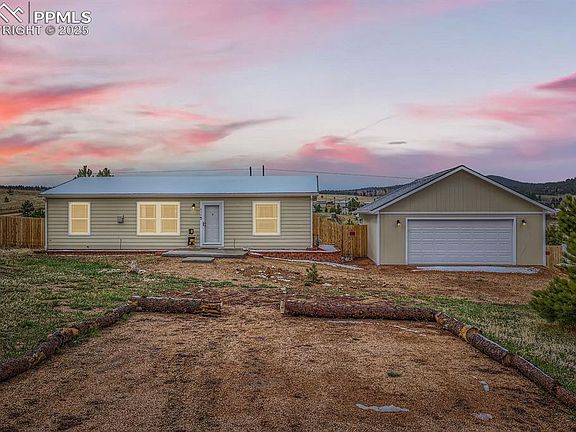 Welcome to the enchanting Sherwood Forest neighborhood — where peaceful living meets mountain living and breathtaking views! This amazing mountain home offers the rare opportunity to settle into a serene community surrounded by Colorado’s finest landscapes. Boasting 3 spacious bedrooms, 2 pristine bathrooms, and 1,166 square feet of thoughtfully designed living space, this home effortlessly blends modern comfort with timeless elegance. Perched on a gently sloping .69-acre lot, you’ll wake up each day to jaw-dropping views of iconic Pikes Peak and majestic Raspberry Mountain. Imagine sipping your morning coffee sitting on the back deck overlooking your fully fenced back yard or watching the sun rise over the mountains, or winding down your evenings under a sky full of stars, it’s all part of everyday life here. Built just five years ago, this home shines with contemporary features including a luxurious granite kitchen, perfect for inspired cooking, and a bright, open great room adorned with engineered wood flooring and sophisticated wainscoting. Outdoors, enjoy both convenience and versatility with ample off-street parking for multiple cars or your RV and a huge 25x30 oversized detached garage — ideal for vehicles, hobbies, workshop or extra storage. The Sherwood Forest community is known for its quiet streets, friendly neighbors, and abundant wildlife, offering you a rare blend of privacy and connection to nature. Whether you're exploring the trails, marveling at local deer, or simply soaking in the stunning sunsets, this neighborhood captures the heart of Colorado living. Don’t miss your chance to claim a peaceful mountain lifestyle with all the modern comforts you deserve. Call today to schedule your private tour and make this extraordinary property your forever home! The back shed is insulated & sheet rocked and was used as an office. The rear property line extends approx. 35 feet past the back fence up to telphone pole. Left property line - another 10 ft.