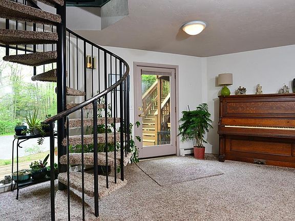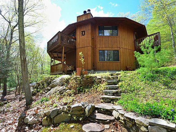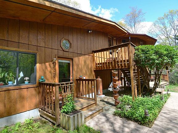 Private Tranquility nestled atop the hill. Unique Contemporary Designed for the future and creates a seamless connection between you and your environment. In this Classic Deltec model the self-supporting roof system means no load-bearing walls, 2x6 construction & steel beams. The round shape also allows you to capture panoramic views and truly bring the outdoors in. The floor-plan is intentionally designed to maximize energy efficiency and functionality. Large 1st floor in-law is Handicapped accessible with 2 beds, living room open Kitchen and large Bath. First Floor also has Family Room with Fireplace, Bedroom, Laundry Rm, and Full Guest Bath. Upper Level was designed to enjoy the views. Open Living Rm with Fire place takes advantage of large sliders to decks. Kitchen with breakfast bar and many upgrades like Jennair cook top with pop up auto draft & grill. Large beautiful built in cabinets. Master Bed with electric fireplace has private deck and large private bath with shower stall, soaking tub, & his & hers sinks. Recreation/Exercise room has Jacuzzi hot tub and loads of storage. Custom large storage tool shed with electricity. There is a flat area for possible future garage. 4 bed septic, wired for a generator. Lovely country Road.