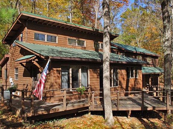Rustic home in the woods. Close to Conley Bottom Marina. Quaint on the inside, with Master Bedroom on the main floor, and another bedroom up. Huge bonus room or master bedroom above the garage with its own bathroom. Hardwood flooring and cedar closets, just some of the features. Not to mention, the 2 car detached garage(with storage above, and 220 electric), and the 2 car attached, with it own small mini bar. Covered deck, and uncovered deck area. Great full time home, or weekend retreat. Comes Furnished.