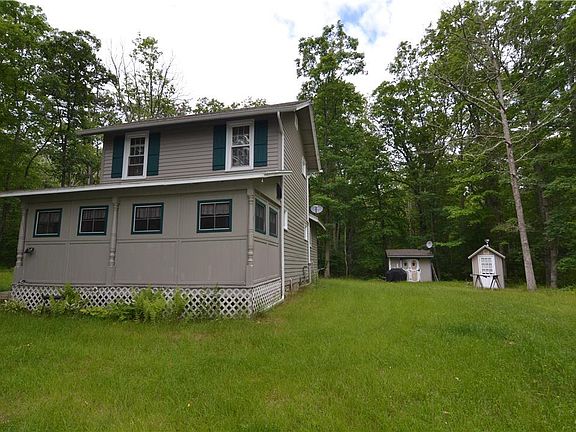 Recreational Hunting Cabin in PA State game lands in Delaware State Forest. Must be a PA resident to purchase and lease from state. Cash purchase only. Land Lease is $200/year. Home is two story with living room, dining room, kitchen, and loft bedroom with RV toilet and shower. No well or septic to home. Holding tanks for water. Propane HWH. Wood stove heats home. Outhouse. No electric service to cabin. Generator hookup only. Do Not enter property without an appointment. Close to Bushkill Falls, Lake Wallenpaupack, and Peck's Pond.