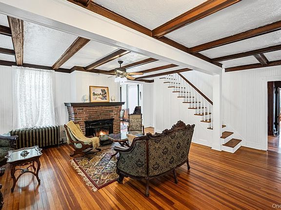 Inside, the home showcases original fir hardwood floors, intricate crown molding, antique light fixtures, and ornate radiators. Period details abound, from the rare French Godin stove in the dining area to a traditional fireplace in the living room—adding both charm and warmth. The eat-in kitchen retains its classic appeal while offering generous space for gathering.