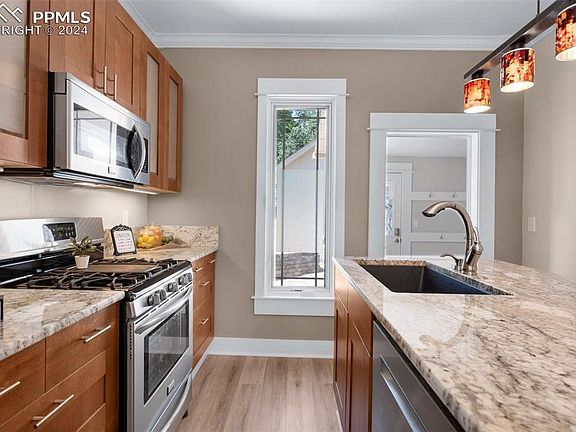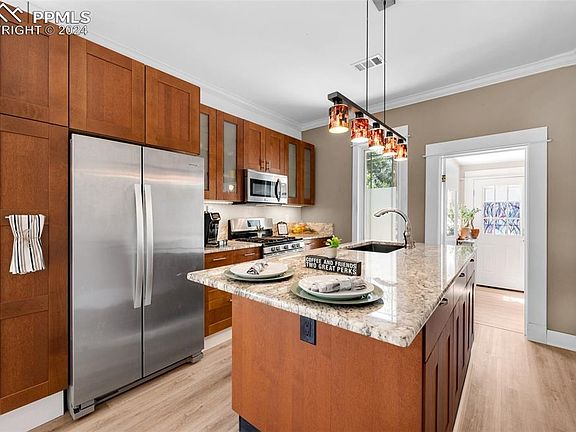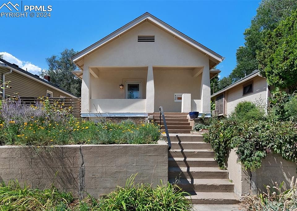 Step into timeless elegance with this newly stuccoed 1905 home that seamlessly blends historic charm with modern upgrades. Central AC & tankless water heater! Prime location, this 4-bedroom, 2-bathroom residence offers an inviting atmosphere, perfect for those who appreciate architectural character and contemporary comforts. Brand new roof and gutters! You'll be greeted by a large covered porch. The main level boasts new luxury vinyl plank flooring, complemented by 9-foot ceilings, 12-inch baseboards, and intricate crown moulding, which accentuate the home's historical character. The heart of the home, the kitchen, is recently remodeled. It features granite countertops, cherry cabinets, a spacious granite island, and soft-close cabinets and drawers. Stainless steel appliances, and under-cabinet lighting make this kitchen both beautiful and functional. The master bedroom is truly unique, featuring a surround sound system, ceiling fan, and built-in shelving - a perfect sanctuary after a long day. The partially finished walkout basement adds incredible versatility to this home. It includes a kitchenette, a secondary suite with a private entrance, a cozy family room, and a spacious craft or workshop area, making it ideal for multi-generational living or guest accommodations. Outside, the backyard is an oasis with paver stone pathways and an Arctic Spa saltwater 3-person hot tub, offering the perfect setting for relaxation. The property includes a detached 2-car garage with alley access, plus an additional 22x15 parking area. Situated in a walkable neighborhood, this home is just minutes from schools, parks, and all that downtown has to offer! Enjoy a leisurely stroll to Monument Valley Park and the Pikes Peak Greenway Trail or take a quick 2-minute drive to I-25 for easy commuting. With Acacia Park only a 19-minute walk, you'll love the convenience of this central location. Don’t miss the chance to own a piece of history with all the modern amenities you need!