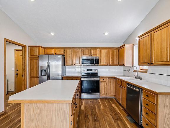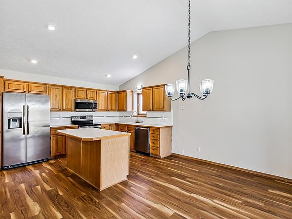 This lovely four bedroom home in Derby has tons of space and exceptional features throughout. Boasting great curb appeal with a partial whitewashed brick exterior and new exterior paint, this home radiates charm from the moment you arrive. Notice the newer concrete on the porch and driveway as you head up front. Inside, the living areas are graced by soaring vaulted ceilings, creating an airy atmosphere. The living room is centered around a cozy fireplace, perfect for gatherings or quiet evenings. Gleaming wood laminate floors flow throughout the living areas, adding warmth and elegance. The kitchen is a chef or baker's dream, with tons of cabinet space including a pantry, an eating bar island, and stainless appliances that are included. Adjacent to the kitchen is the dining room, conveniently seated in front of sliding glass doors that open to the back deck, offering a seamless transition for indoor-outdoor entertaining and lovely views while you enjoy a meal. There's also a conveniently-located laundry room just off the kitchen. The main floor features a spacious master bedroom with brand new carpet, a vaulted ceiling, and an en suite bath that boasts a double vanity, shower, and jetted tub. Two more bedrooms and another full bath complete the main floor. But the space doesn't end there! Head down to the bright basement with view-out windows, where you'll find even more room to enjoy. A family room with a brick fireplace provides the perfect spot for relaxation, while a fourth bedroom and third bathroom offer additional accommodations. A bonus room in the basement could be used as an office, home gym, or playroom, catering to all of your needs. With over 2,500 square feet of finished space, this home gives you plenty of room to spread out. It's also located close to tons of amenities, including local schools, restaurants, shopping, parks, Rock River Rapids Aquatic Park, and so much more! Schedule your private showing and hurry in to see this gem today before it's gone forever!