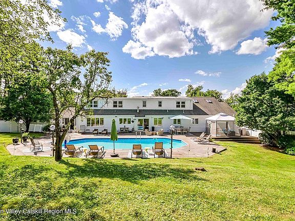 Welcome home to 430 Pearl Street, where Kingston's luxuries are at your fingertips all while having exclusivity to your own oasis! Located at the top of one of the area's most prestigious and sought after streets, this grand home is perfectly perched on a meadow-like setting allowing gorgeous views of the Catskill Mountains! The backyard gives off resort vibes with its fabulous inground pool bordered by beautiful bluestone, mature landscaping including flowers and fruit trees, lots of room for relaxing and entertaining, and all with privacy provided by enclosed fencing and greenery. The covered front porch is the perfect spot to take in some fresh air, enjoy the quietness of the neighborhood, and drift away while admiring the sight of the Catskills. Allow the double stained glass doors to greet you home into the entryway. Cozy up to the woodburning fireplace near the oversized bay window in the formal living room and gaze away at the mountain view. The large primary suite is conveniently located on the first floor. It has abundant built-in closet space, a designated dressing area with a walk-in closet, all which lead to the primary bath. The country style kitchen has custom built-ins, exposed wood beams, and a large eat-in area. The formal dining room will be a memory maker with enough space to host plentiful gatherings. The screened in, bluestone porch is perfect for spending summertime nights, or the crisp, autumn days taking in the foliage. The second level of the home hosts four bedrooms(all with closets), two full bathrooms, generous storage space, and a vast hallway with a desk/work station. One of the greatest attributes to this home is its finished basement which contributes an additional 2000 square feet! Aside from the bountiful amount of living space available for lounging, recreation, work, hobbies...whatever your pleasure; this basement comes equipped with a vintage 1950's kitchen with original appliances, pink atomic countertops and a peek-a-boo window bar! A substantial laundry room, a full bathroom, an extra room with a closet, and a storage room also reside in the basement. The two car pull-under garage and impressionable U-shaped driveway provide ample parking for family and friends. A true Kingston gem with charm!