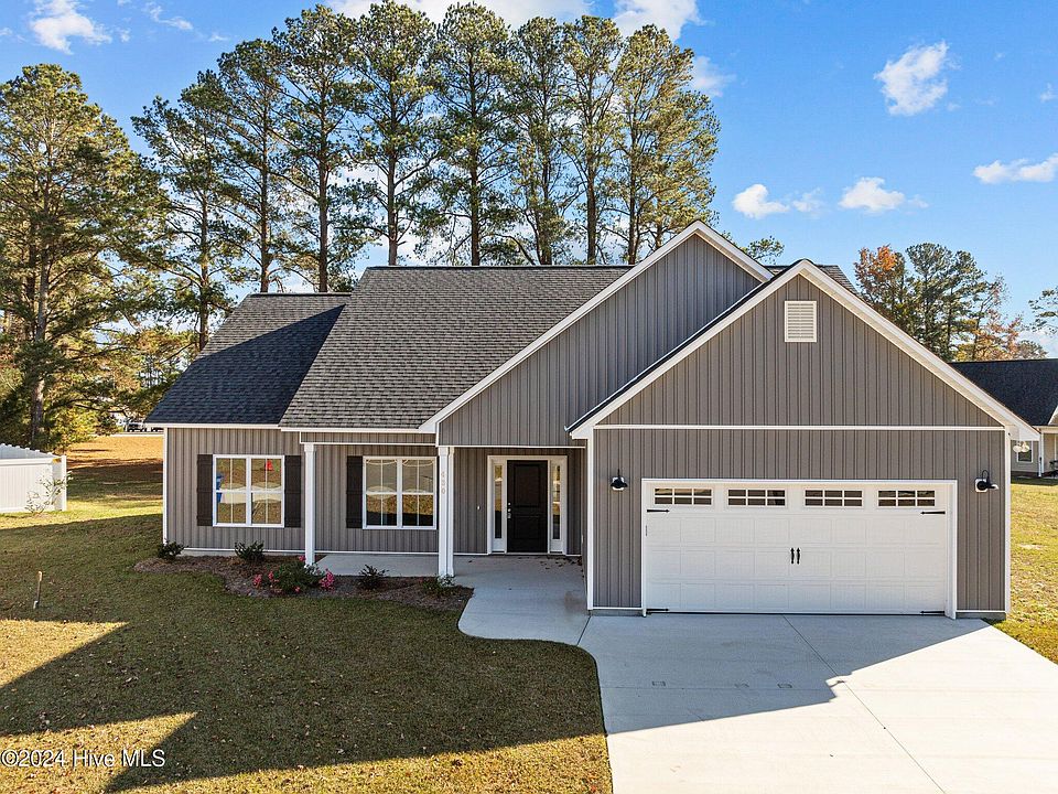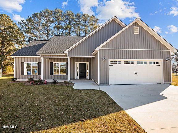 Newly constructed home by Rocky Russell Builders in Ayden, NC offering 3 bedrooms, 2 bathrooms and garage. The beautifully crafted residence offers 1,552 square feet of open living space. From the moment you enter the front door your greeted with an abundance of natural light that reflects the warm color of the luxury vinyl plank flooring throughout the main living areas. The living room, featuring a beautiful fireplace, opens up to the large kitchen and connects to the back patio. The functionally designed kitchen provides granite countertops, a large island, stainless steel appliances and elegant fixtures. The primary suite, located on the other side of the home from the 2 guest rooms, provides a large walk-in closet, ensuite bathroom with a walk-in shower and dual vanities. A wonderful home for a growing family and perfect for entertaining!