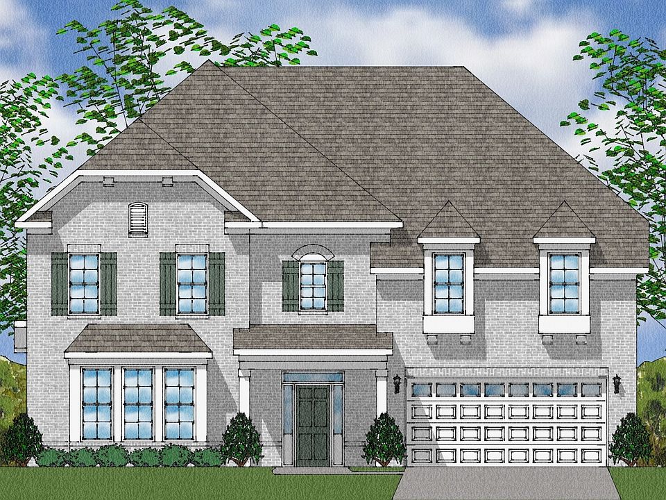 Gracious Duvall II C, with its astounding two-story foyer, five bedrooms, four baths, and large bonus room, offers a coveted first floor office/guest room and amazing primary suite. Formal living room beckons for attention, with its inviting window seat. Adjacent dining room dazzles with its coffered ceiling. Pop into the gourmet kitchen, which boasts a drop-in cooktop and wall ovens, quartz countertops, pendant lights, upgraded white cabinetry, and Farmhouse sink. The spacious family room sets the stage for effortless entertaining with a gas fireplace and entry onto the covered porch. Lustrous hardwoods blanket the main living areas and intersect with an impressive open-ended hardwood staircase. Upstairs large primary suite features a sitting area, gas fireplace, enormous walk-in-closet, and formidable private bath with separate vanities, tiled shower and separate garden tub. Rounding out this home are three upstairs bedrooms, a massive bonus room, and fenced yard.