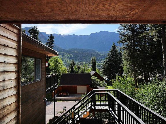 Ouray Colorado: Beautiful 3 story Cedar home on quiet back street on the west of town (Queen street area)/ overlooking the town with direct views to the famous amphitheater Mt rim in downtown Ouray/Home: 5000 SF (heated area) /Featuring 4 Beds (2 master bedrooms) + 2 flex rooms (entertainment/game rooms) + 1 bed separate apartment (ground level)/ large-oversized 2 car garage and workshop (utility room w/boiler). First level/ Living room level: living room with floor to ceiling view windows /moss rock gas fireplace/ glass doors open to the East on to a full length wrought iron viewing deck/ office/ bathroom-Kitchen level-second level: Full kitchen/separate glassed in formal large dining room off of the kitchen: Entertainment level: Pool room & entertainment room-bar room (can be 2 flex room-bedrooms). 3rd level/Bedrooms: 4 Bedrooms (2 masters). Perfect for large family or multi-generational living/ lock off Rental apartment- ground level. Borders 20-acre green space on west side of the lot (see GIS mapping).