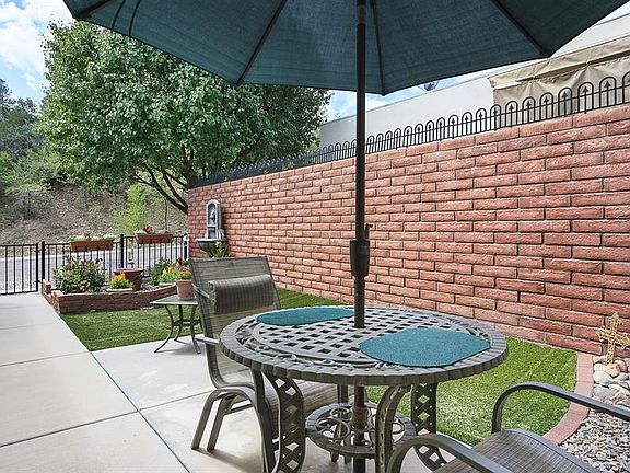 Top of the neighborhood! Beautifully appointed single level town home with over sized 2-car garage located at the top end of the subdivision with elevated views and abundant privacy. Fully enclosed patio and garden area with iron fencing and gates. Many upgrades: new water heater, new gas furnace, central a/c, high end Nafco Elements Luxury flooring in kitchen, fresh interior paint, retractable screen door and so much more! Furnace and A/C come with transferable maintenance plan.