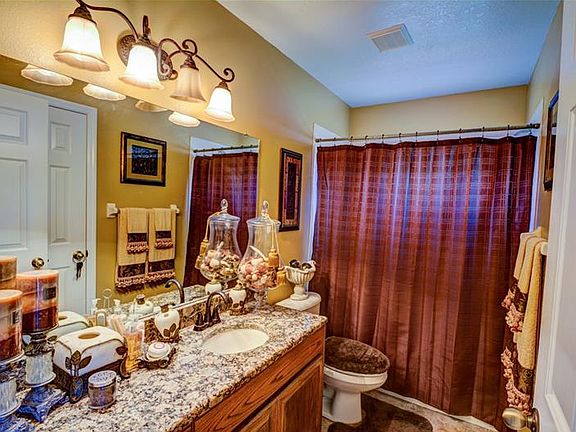 This amazing home is located in the coveted Brentwood Hills community. Inside you will find an amazing floor plan that features a large formal living and dinning area right off the open foyer. The family room sits conveniently off the kitchen split by a large granite breakfast bar. The kitchen is huge with tons of cabinet space, and a eat in area with a built in bench. The four bedrooms are split three ways allowing privacy between the master, the guest room, and the two secondary bedrooms. There are granite counters throughout the home, stone accent walls, and the tile flooring encompasses all the traffic areas and wet areas. There is a covered lanai in the rear of the home that has direct access from the family room, the master bedroom, and the guest hallway. You really have to visit this home to see all the detail and thought put into everything from the design to the upgrades which are plentiful down to the many unique light fixtures.