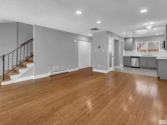 Living in the heart of Reno! A charming townhome with interior design finishes throughout. The upgraded Bamboo flooring leads you into the open kitchen featuring refinished cabinets, solid surface countertops, stainless steel appliances & a custom built-in pantry with etched glass door. Your large living room is adjacent to the dining space and kitchen, perfect for entertaining! 1/2 bath & Laundry downstairs. Updated bathrooms, lighting, hardware, paint & blinds throughout. Convenient to all shopping., Oversized master bedroom with an abundance of natural light and a large closet, plenty of storage space! The bathroom has been remodeled with dual vanities and a shower/tub combo. This townhome has beautiful views of the common area and greenbelt and also features a covered outdoor patio space! Additional features included: custom pantry with etched glass door/deep shelving and spice shelving, laundry space with additional shelving and storage, nickel hardware throughout, added lighting to kitchen/living rm/stairway/both bedrooms/upstairs bathroom closet, ceiling fans to both bedrooms, extended concrete in patio, added tile/cabinets/shelves to laundry rm, chandelier in dining area, new back gate with lock, new slider door and lock, slider door screen, freshly painted baseboards/doors/downstairs, bidet in downstair bathroom. This townhome is turnkey and move-in ready.