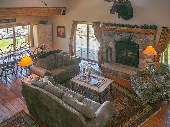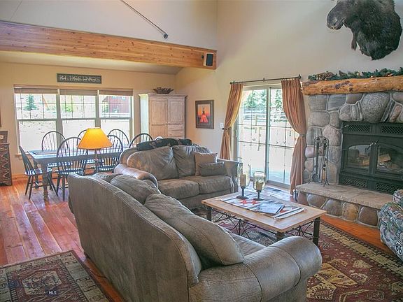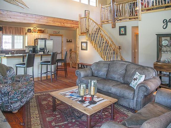 Single-family residence in desirable South Fork subdivision is now available! This well cared for home welcomes you from the moment you enter. Cozy & bright, this mountain home delivers, wether it is your year-round primary place, or a weekend getaway. You will immediately notice the high vaulted ceilings complete with beams, the river rock fireplace, the hand-sawn hardwood floors, the natural wood railings, & the abundance of natural light. This home offers a very livable floor plan with a main floor master, additional main floor bedroom & full bath; open living and dining areas for small or large gatherings; & an upstairs family room loft area that is open to below. The daylight lower level features a large family room, a pool table room, two bedrooms & a full bath. Updated kitchen & master bath make it move-in ready. Enjoy the covered porch & expansive deck to take in the sunshine & mountain views all year round. Price includes furnishings. Come live BIG in Big Sky country!