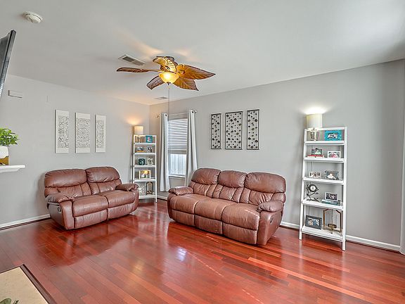A true 4 bedroom plus a loft! Move-in ready! Located in Stoney Creek. As you approach you will notice the nicely landscaped yard and extended driveway. Upon entering you will be greeted with beautiful hardwood flooring in the family room. The family room also has a gas fireplace (propane not connected) and tropical leaf ceiling fan. The kitchen offers 42'' cabinets with crown molding and above display area and a pantry as well as stainless appliances that include: a dishwasher, a built-in microwave, and a smooth top range. The dining area has another beautiful ceiling fan, a laundry closet and a large closet. The glass sliding doors provide more natural light. The downstairs master bedroom has wood laminate flooring, a walk-in closet and beautiful ceiling fan. The master bathroom has porcelain tile flooring, a dual sink vanity and tub/shower combo. The half bathroom on this floor has a pedestal sink. As you make your way upstairs you will notice the loft makes a great entertainment area. It has a ceiling fan and cozy carpet. All three upstairs bedrooms have carpet. Two of them have ceiling fans. The upstairs bathroom has a large vanity, porcelain tile flooring and a tub/shower flooring with transom window for natural lighting. As you exit to check out the landscaped backyard you will find an extended stone patio and walkway, a small pond with a soothing fountain.