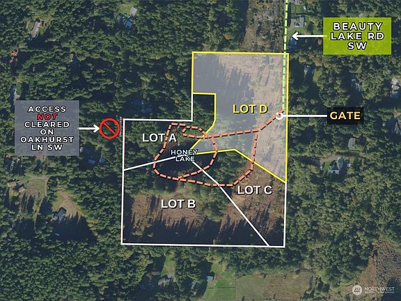 9.92 acre lakeside lot on the private lake known as Honey Lake with owner financing options. Impressive waterfront setting lined w/ trees & offering southwestern exposure. Nice private location yet close to food, shopping, & commuter options like Sedgwick, Sidney, Old Clifton, & Hwy 16. There are multiple areas to build your home. Good soils for a septic & average well depth in the area is 100-125 ft. Power at Beauty Lake Rd SW. Level & gradually slopping topography throughout site. Gated entry w/ roads & nature trails in place. Replanted w/ Douglas Fir. Honey Lake offers great bass fishing & no public access. Need more land? An abutting 4.95 acre site is also for sale along with another 9.92 acre parcel on the other side of lake.