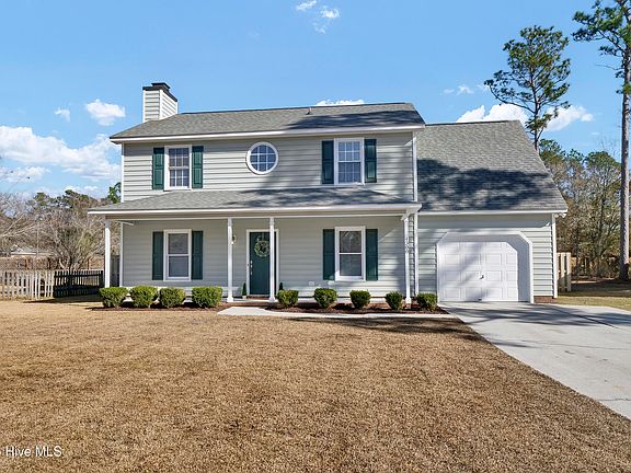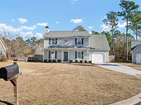 Welcome home to this lovely 3 bedroom 2 1/2 bath two story home located in the desirable community of Northchase in North Wilmington! This home has been recently improved and is ready for new owners! It has an inviting large rocking chair front porch to overlook the quiet cul-de-sac. Great floor plan that includes a living room with recently painted wood burning fireplace, formal dining, and spacious kitchen. Upstairs you'll find 3 beds including the primary suite. You'll love the LVP flooring throughout that is roughly three years old. Enjoy cooking and entertaining in your new kitchen appointed with stainless steel appliances (dishwasher & stove are brand new), leathered granite counters, new subway tile backsplash, pantry, and large sinks with disposal. Other recent improvements include: new hot water heater as of December 2024, new plumbing and light fixtures, fresh interior paint throughout, new electrical panel box, and dryer vent. There is a good size garage for your storage needs and laundry hook ups. There is an active termite bond in place for buyer's peace of mind. The backyard is large and fenced perfect for pets and activities. Northchase is a wonderful community that has great amenities to utilize at an affordable price. There is an outdoor pool, playground, tennis courts, basketball court, and picnic shelter! The location is prime to be close to I-40, Wrightsville Beach, Downtown, area shopping and dining. Come take a look at this fabulous property today! It will not disappoint!