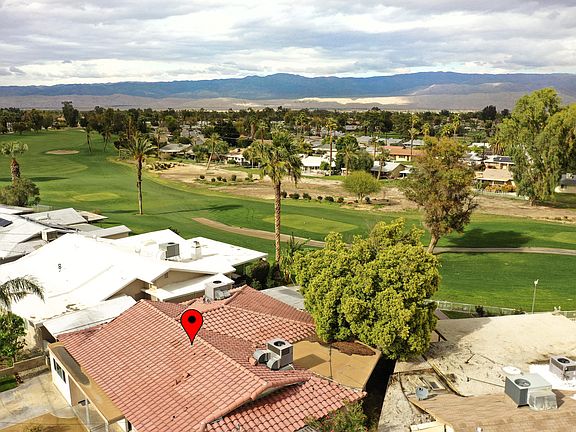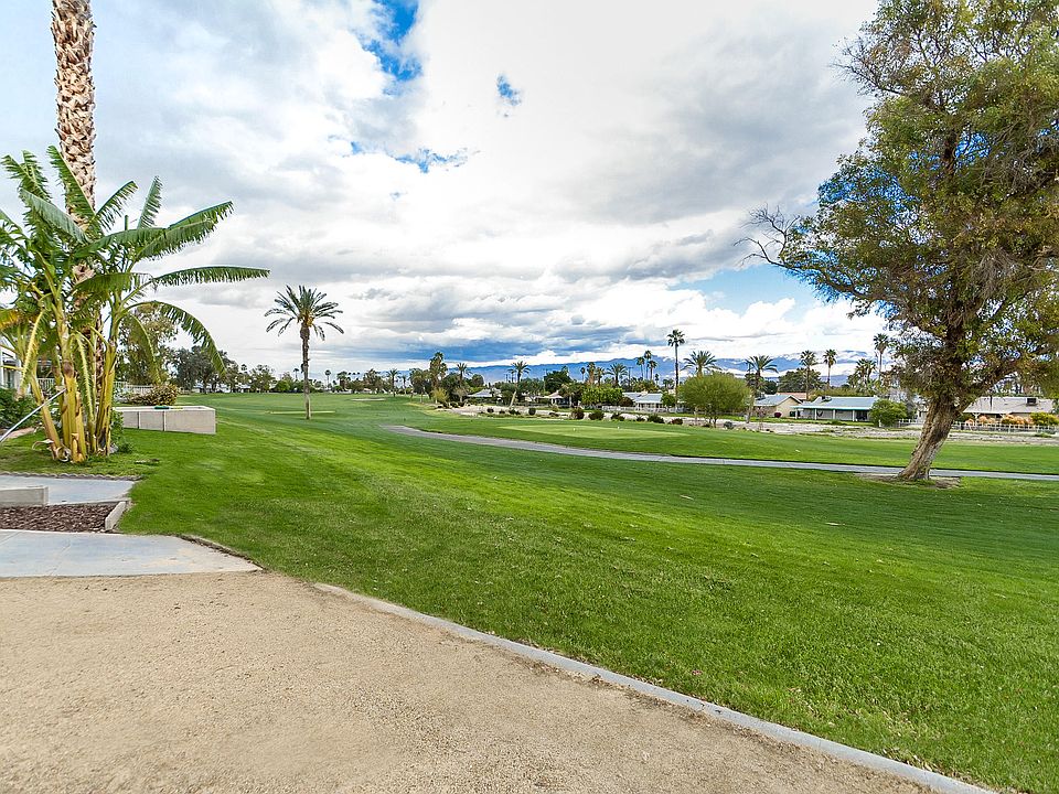 This 1961 home was initially constructed on the golf course to 1,576 SF, but over time the two car garage was converted to living space. The seller estimates the home to be about 2,000 SF (EST.). Buyer to verify. There are four bedrooms, two baths, a laundry room, kitchen, a huge great room and a flex room off the great room. There is also a golf cart garage and driveway parking for vehicles. Inside there are two A/C units, new fresh paint, new front doors, new windows, new carpet, tile flooring, an updated master shower and the kitchen was recently remodeled including a new stove. There is a stool height bar that connects the kitchen to the great that is ideal for entertaining. The North East facing rear patio is just off the edge of the fairway and the view here is spectacular! Gorgeous mountain sunsets and lingering twilight skies are fabulous. The backyard has room for a pool. This home has been well maintained and with recent updates is move-in ready. There is a covered carport and plenty of parking on two driveways. The Palm Desert Country Club, with a bar and restaurant, is just a short walk across the street. You will love the very low HOA dues. A great value!