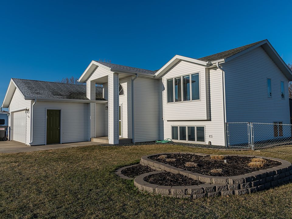 This beautiful home has 4 bedrooms and 2 full bathrooms. Located in Mandan the main floor of this home features vaulted ceilings in the living, kitchen and dining room, and 2 bedrooms with one of the bedrooms attached the main floor bathroom. Living room is wired for surround sound. Dining room features a sliding patio door to the deck. Deck has new paint and stairs to the backyard. The bottom level of this home features a family room with 2 more bedrooms and 1 bathroom. Laundry is located in the mechanical room. This home also features a full fenced back yard and 2 car garage. There is also plenty of room for a camper pad next to the garage.