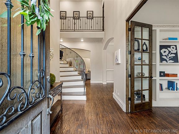 Welcome to this exceptional rare find on over 0.60 acre double lot backing to private wooded green space located in gated Cross Timbers at Wind River in the award winning Jenks Southeast School District! This home offers comfort, elegance and luxury living with extensive crown molding, hand scraped hardwood floors, vaulted ceilings, updated lighting, large windows and a family friendly open floorplan. Guests are welcomed by a sweeping iron & wood staircase, vaulted formal study with full wall of built-ins and cast stone fireplace and a lovely formal dining room! The large open family room open to the kitchen is perfect for entertaining graced with a beautiful cast stone fireplace with gas logs, soaring coffered ceiling with cross beams and warm hardwood floors. Gourmet granite kitchen with large center island with seating bar, granite apron sink and prep sink is loaded with awesome SS Kitchen Aide appliances and a delightful breakfast nook looking on to the gorgeous park-like back yard! The Butlers bar leading to the dining room with ice maker, prep sink and huge walk-in pantry is sure to impress! The private Primary Suite boasts an adjoining unique flex room perfect for a nursery or home gym! Also included is an En-suite bath w/tiled shower, soaker tub, dual granite vanities, and large walk-through closet to the utility room. Split from the primary suite is an additional large guest suite with Ensuite full bath and walk-in closet. The second floor boasts a game room positioned over the garage with Juliet balcony, 2 large bedrooms w/walk in closet and jack-n-jill bath, and additional private bedroom suite with Ensuite bath and walk in closet. There is wonderful walk out attic storage space and the 3 car garage has an F-5 tornado rated Family Safe Room. This massive backyard with full privacy fencing and sprinkler system has endless possibilities to be transformed into a spectacular private outdoor oasis! Don’t miss this one!